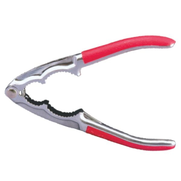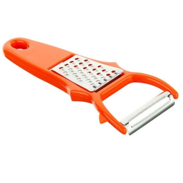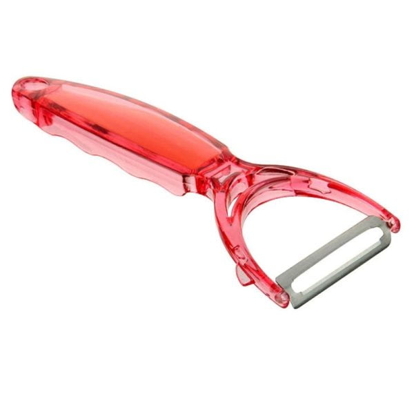 Dispozitiv pentru curatat legume si fructe, cu razatoare, din plastic, rosu